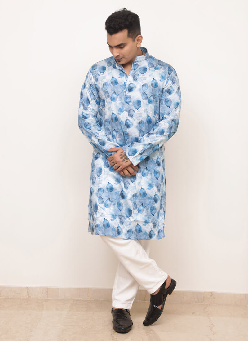 Refresh your ethnic wardrobe with this Blue Printed Men’s Kurta. Designed in a smooth, breathable fabric, it showcases an artistic watercolor-style leaf print in varying shades of blue and white. The mandarin collar and classic button placket add a touch of modern sophistication, making it a perfect pick for festive gatherings, casual celebrations, or summer events.