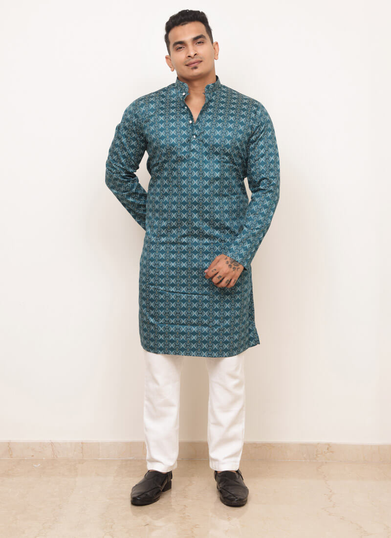 Enhance your ethnic look with this Beige & Golden Printed Men’s Kurta. Crafted from a silky cotton satin-finish fabric, it features an all-over geometric circular motif in shades of beige, golden, and brown with a subtle sheen. The mandarin collar and engraved white buttons add a refined touch, making it an excellent choice for festive occasions, evening gatherings, or special celebrations.