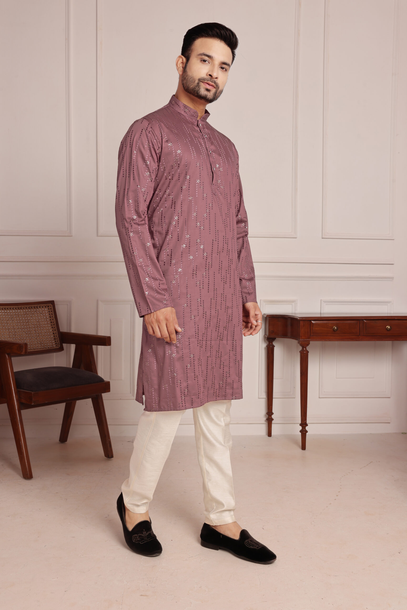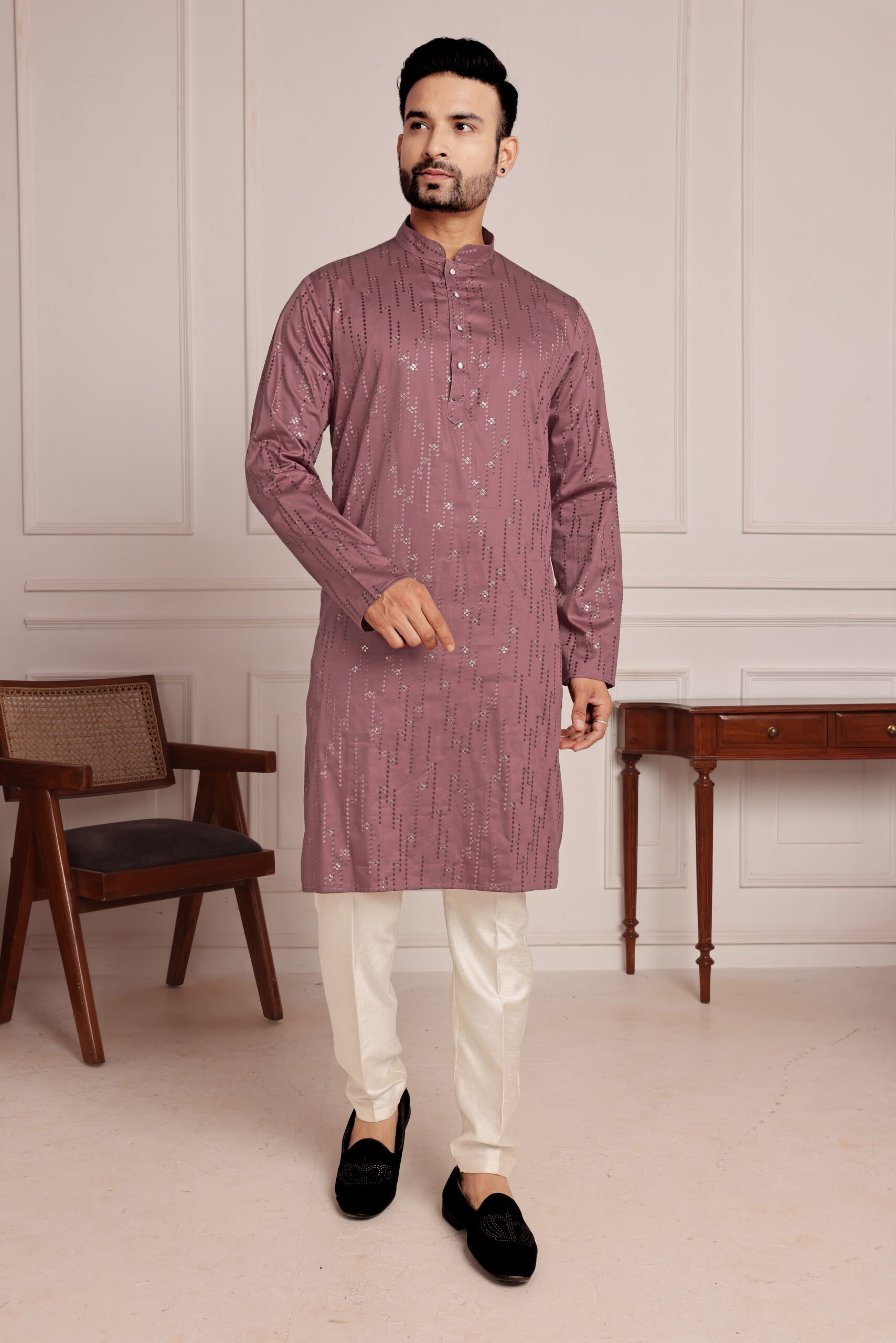 Elevate your wardrobe with this rich, reddish-mauve Men’s Embroidered Shirt. Crafted from a smooth, cotton fabric, this shirt features intricate floral and geometric embroidery in gold and mauve thread, creating a refined and sophisticated design. The mandarin collar adds a modern, sleek touch, making it perfect for semi-formal and festive occasions.