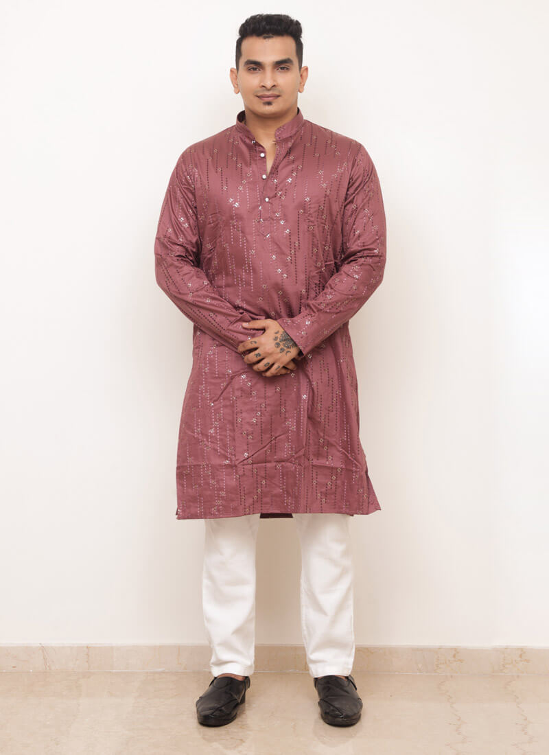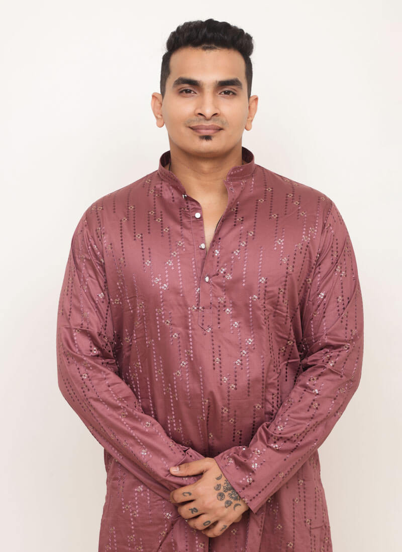 Elevate your wardrobe with this rich, reddish-mauve Men’s Embroidered Shirt. Crafted from a smooth, satin-like fabric, this shirt features intricate floral and geometric embroidery in gold and mauve thread, creating a refined and sophisticated design. The mandarin collar adds a modern, sleek touch, making it perfect for semi-formal and festive occasions.