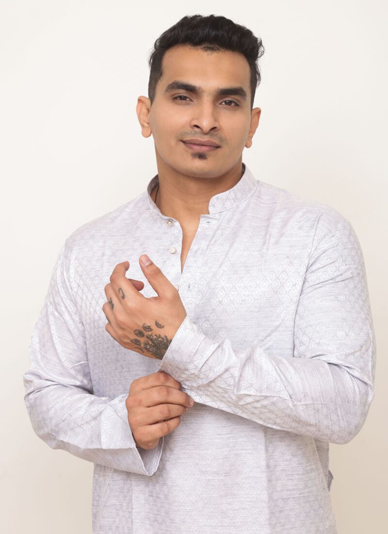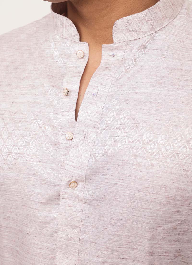 This Light Pastel Pink Men’s Kurta exudes elegance with its subtle shine and intricate embossed geometric pattern. Made from a premium cotton blend, it features a contemporary mandarin collar and wooden buttons that offer a perfect blend of traditional and modern aesthetics. Ideal for festive occasions, casual events, or cultural gatherings, this kurta ensures both comfort and style.