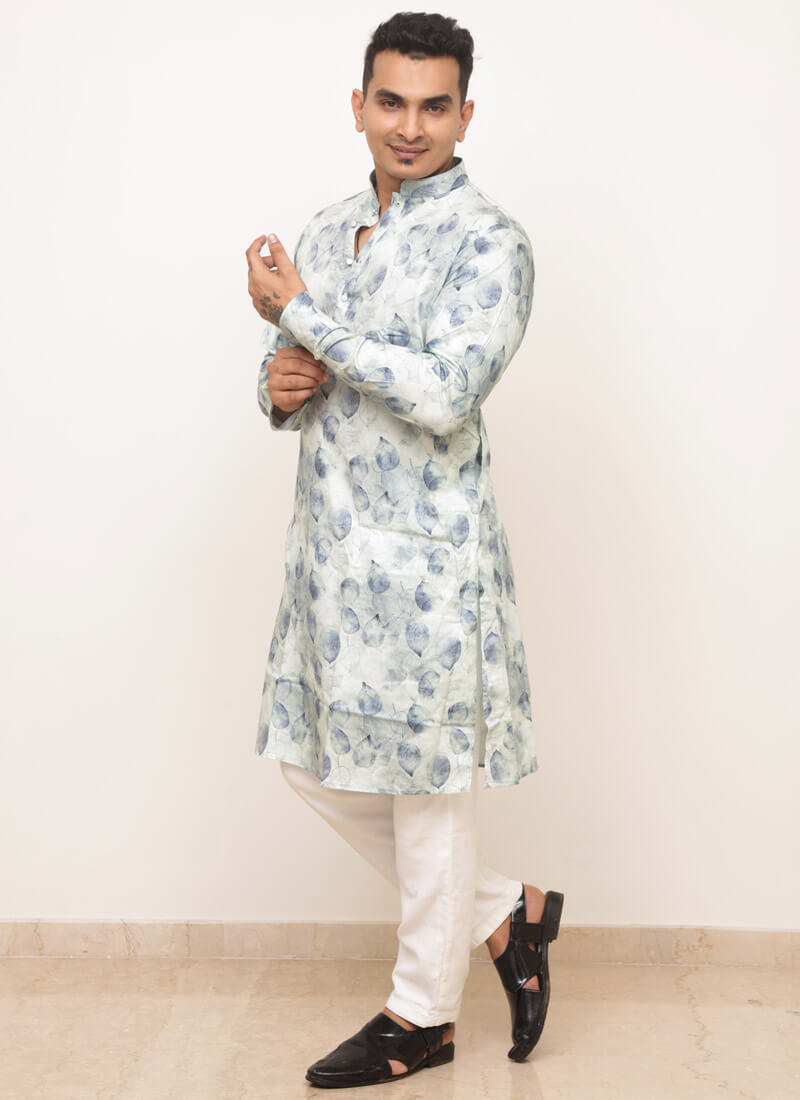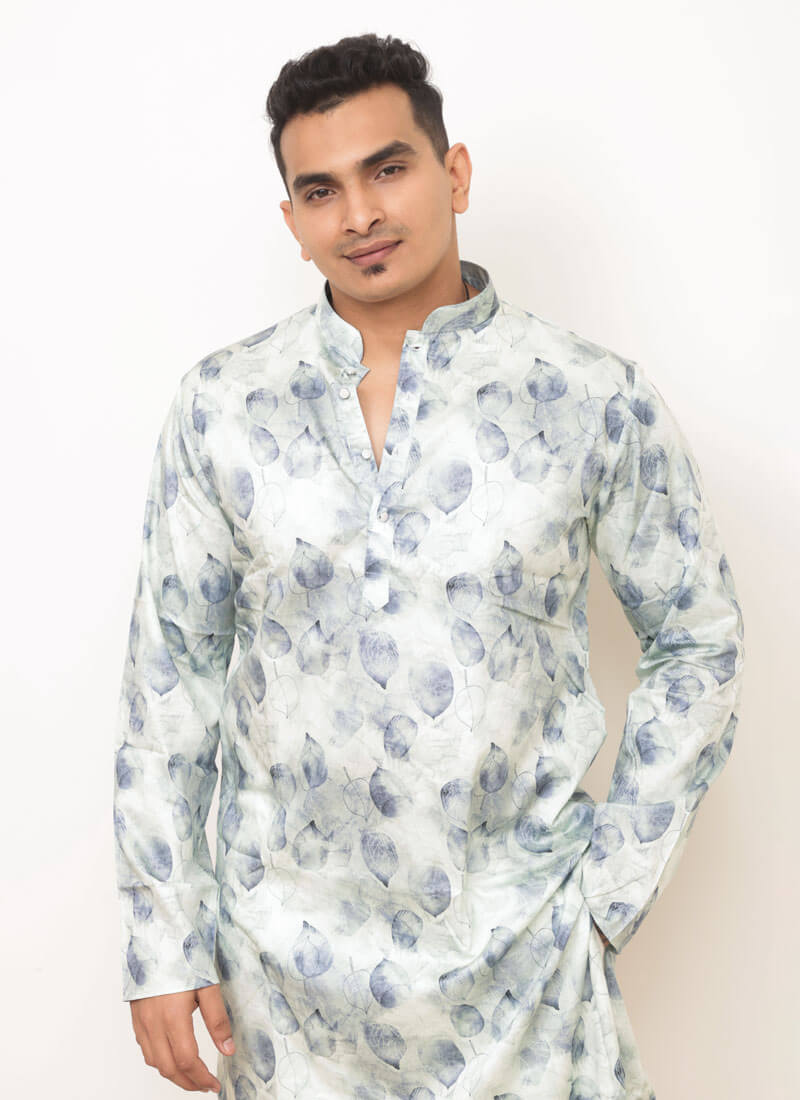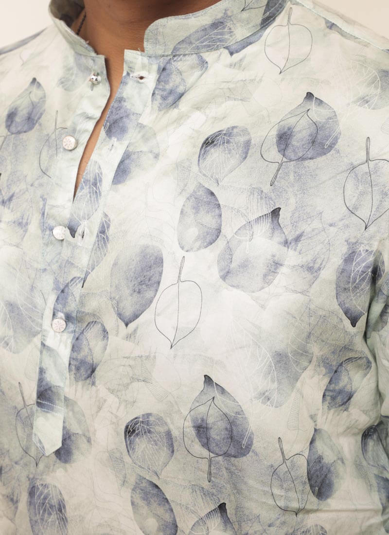 Refresh your ethnic wardrobe with this Blue Printed Men’s Kurta. Designed in a smooth, breathable fabric, it showcases an artistic watercolor-style leaf print in varying shades of blue and white. The mandarin collar and classic button placket add a touch of modern sophistication, making it a perfect pick for festive gatherings, casual celebrations, or summer events.