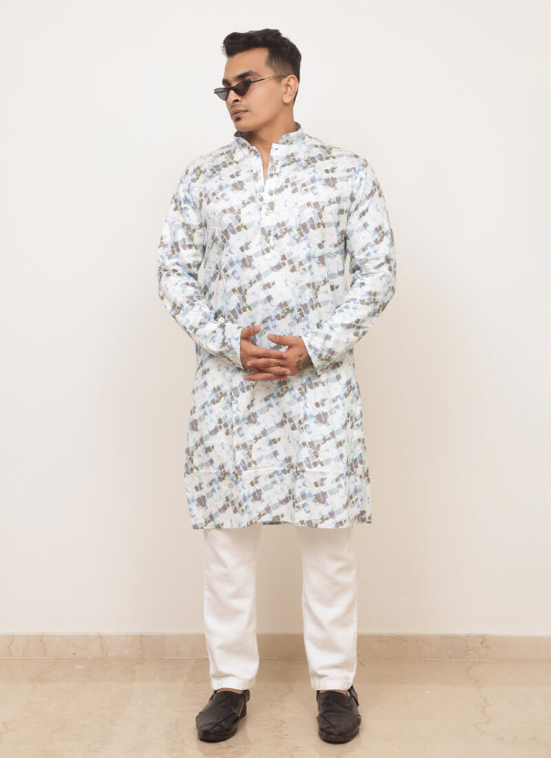 This Men’s Kurta stands out with its artistic brushstroke print in soft pastel tones. Featuring a modern blend of lilac, grey, blush pink, and hints of yellow over an ivory base, it offers a fresh and contemporary look. The kurta is crafted from a premium cotton blend, styled with a mandarin collar and engraved wooden buttons, making it a versatile choice for festive gatherings, cultural occasions, or smart-casual outings.